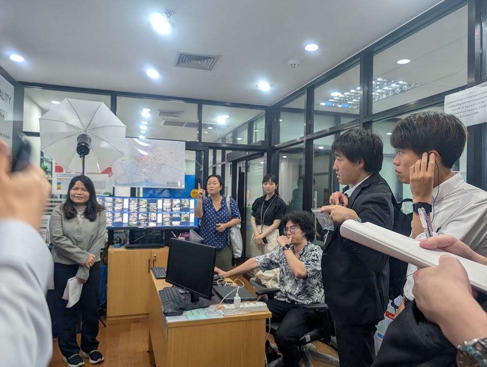 さらに、BMA職員からは深刻化するPM2.5問題への対応として、70か所のモニタリングステーションによるリアルタイム監視と、専用アプリ「AirBKK」を活用した市民への警告システムが紹介されました。参加者は「日本の自治体でも市民向け通知は課題。どのように市民の信頼を得ているのか」と質問し、BMA担当者からは「透明性あるデータ公開とSNS連携が鍵」と答えがありました。廃棄物処理やリサイクルについても、レストランからの食品廃棄を再利用する取り組みや、電池廃棄にポイントを付与するアプリの仕組みなど、ユニークな施策を紹介しました。