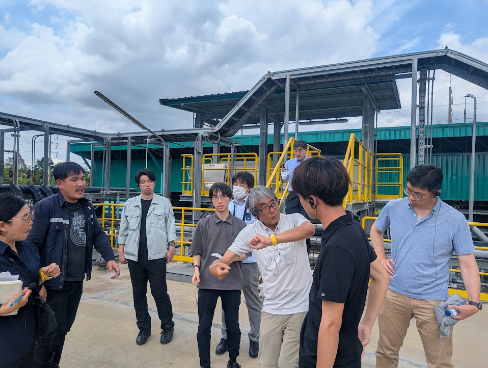 バンコク西部に位置するNong Khaem廃棄物処理場は、市内最大規模の廃棄物処理拠点で、焼却施設、たい肥化施設、感染性廃棄物処理施設、衛生埋立地などを集約しています。視察では、施設職員からが既に稼働中の焼却炉(処理能力300トン/日)や、2026年に稼働予定の大規模焼却施設(1,000トン/日)の計画を説明がありました。特に注目されたのが、ドイツ製の膜生物反応器(MBR)と逆浸透膜を用いた浸出水処理施設です。1日約700m³の処理能力を持ち、廃棄物から発生する高濃度有機汚水を再利用可能な水に浄化し、場内の清掃や緑地散水に活用していました。参加者は「高度な処理技術が地域住民の理解を得る上でも重要」と意見を述べました。